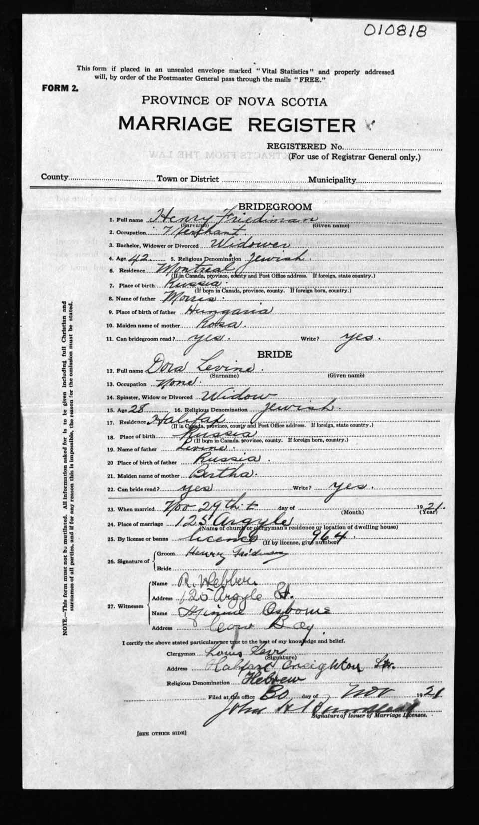 Registration: Year: 1921 number: 10818