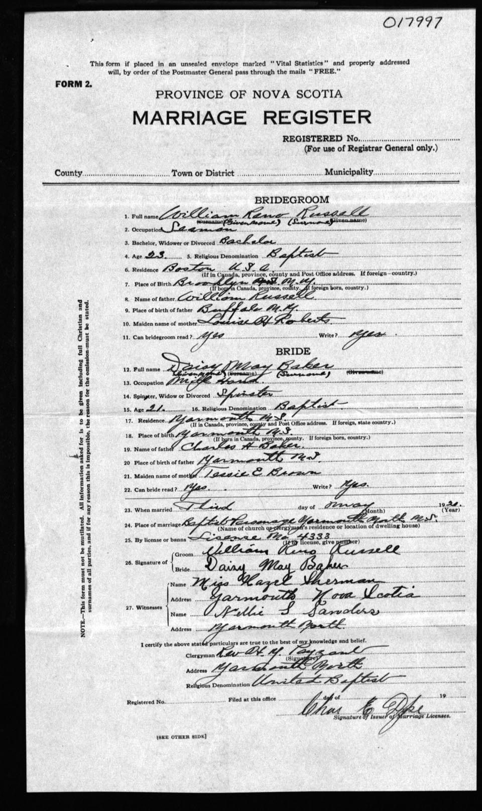 Registration: Year: 1921 number: 17997