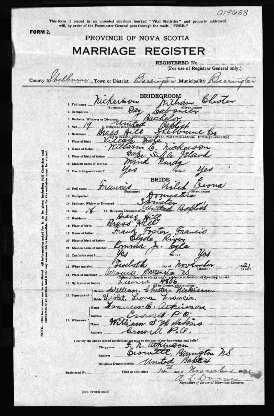 Registration: Year: 1921 number: 19688