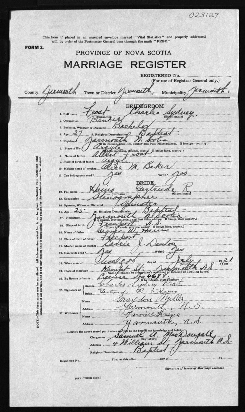 Registration: Year: 1921 number: 23127