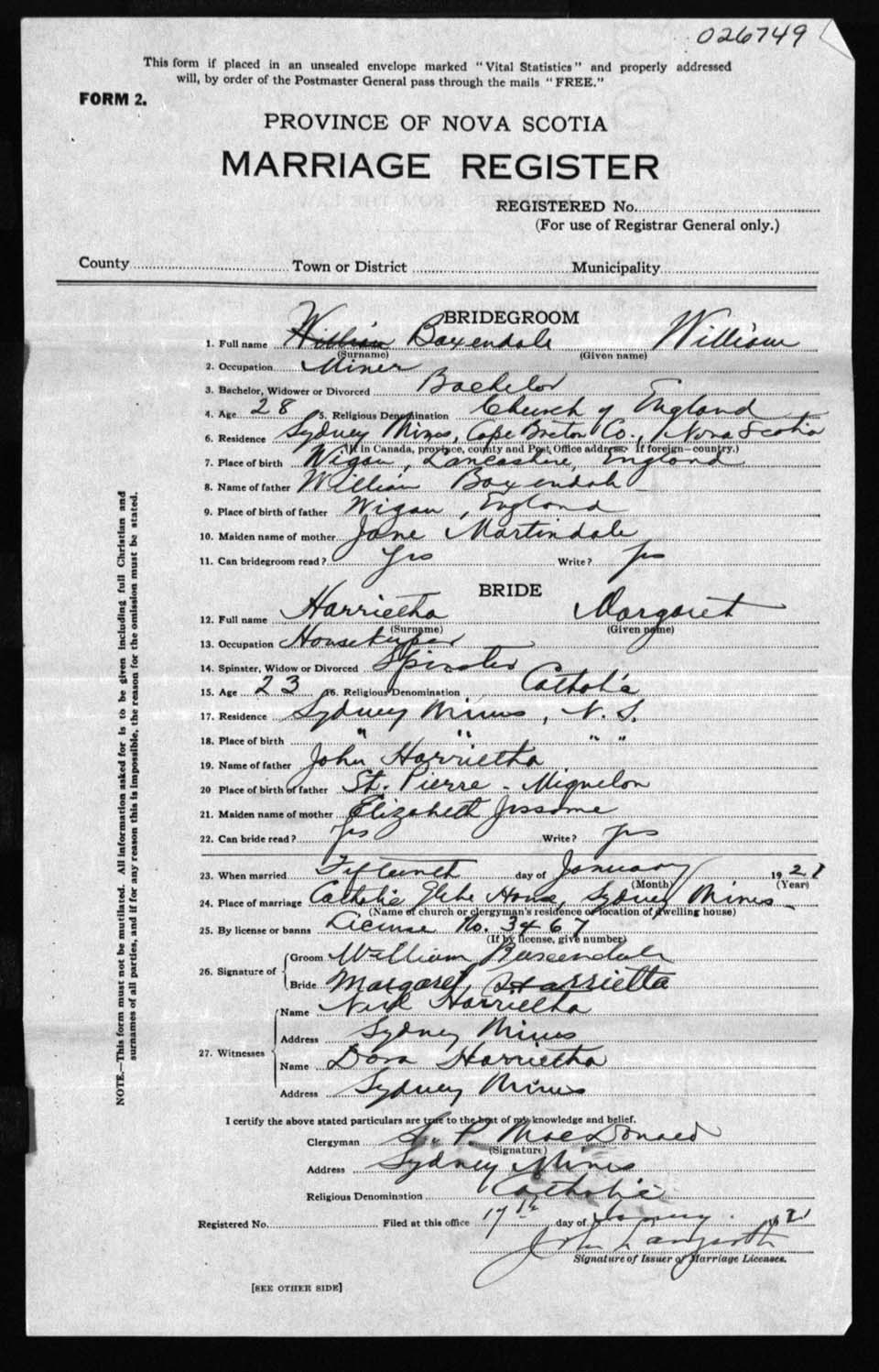 Registration: Year: 1921 number: 26749
