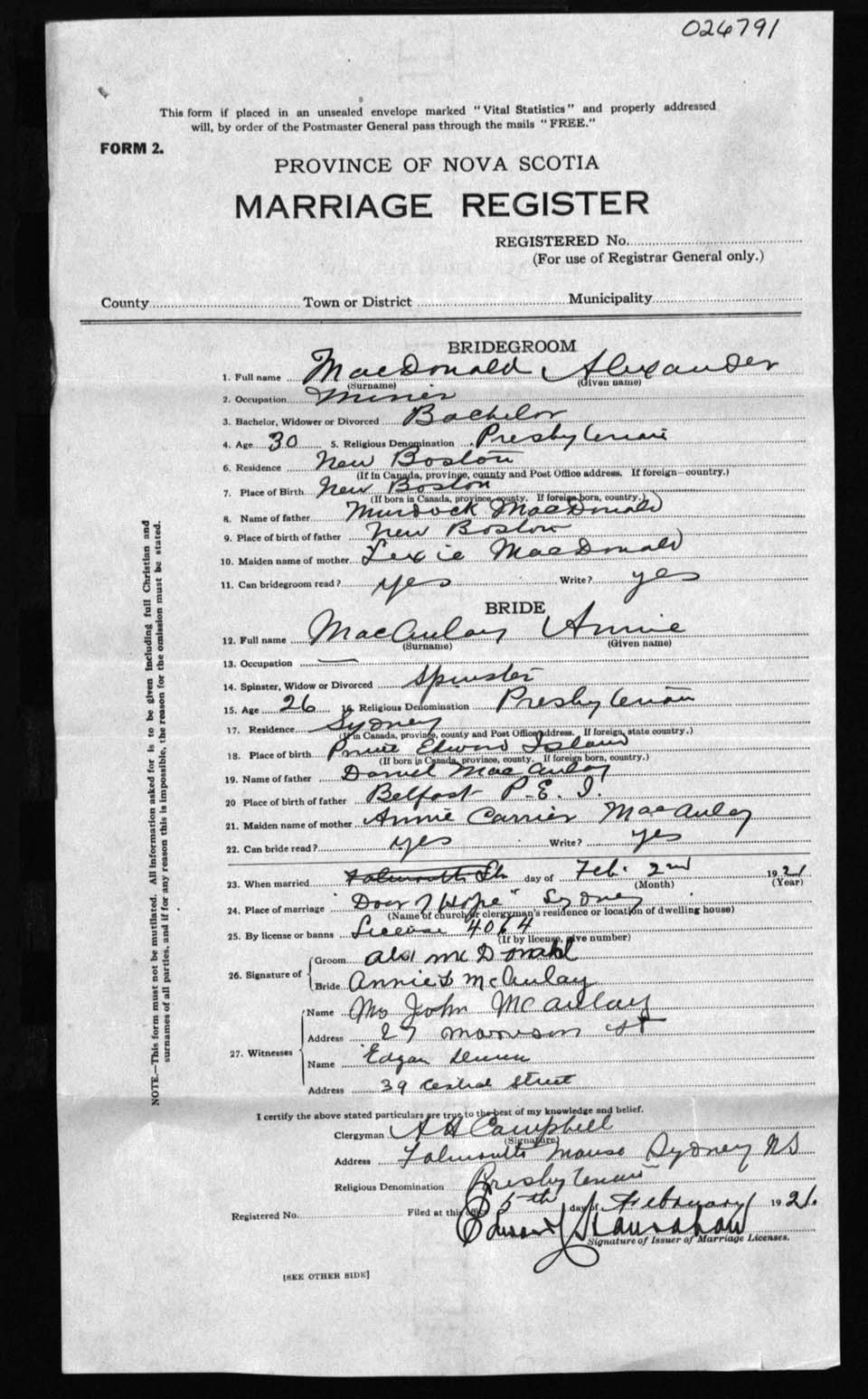 Registration: Year: 1921 number: 26791