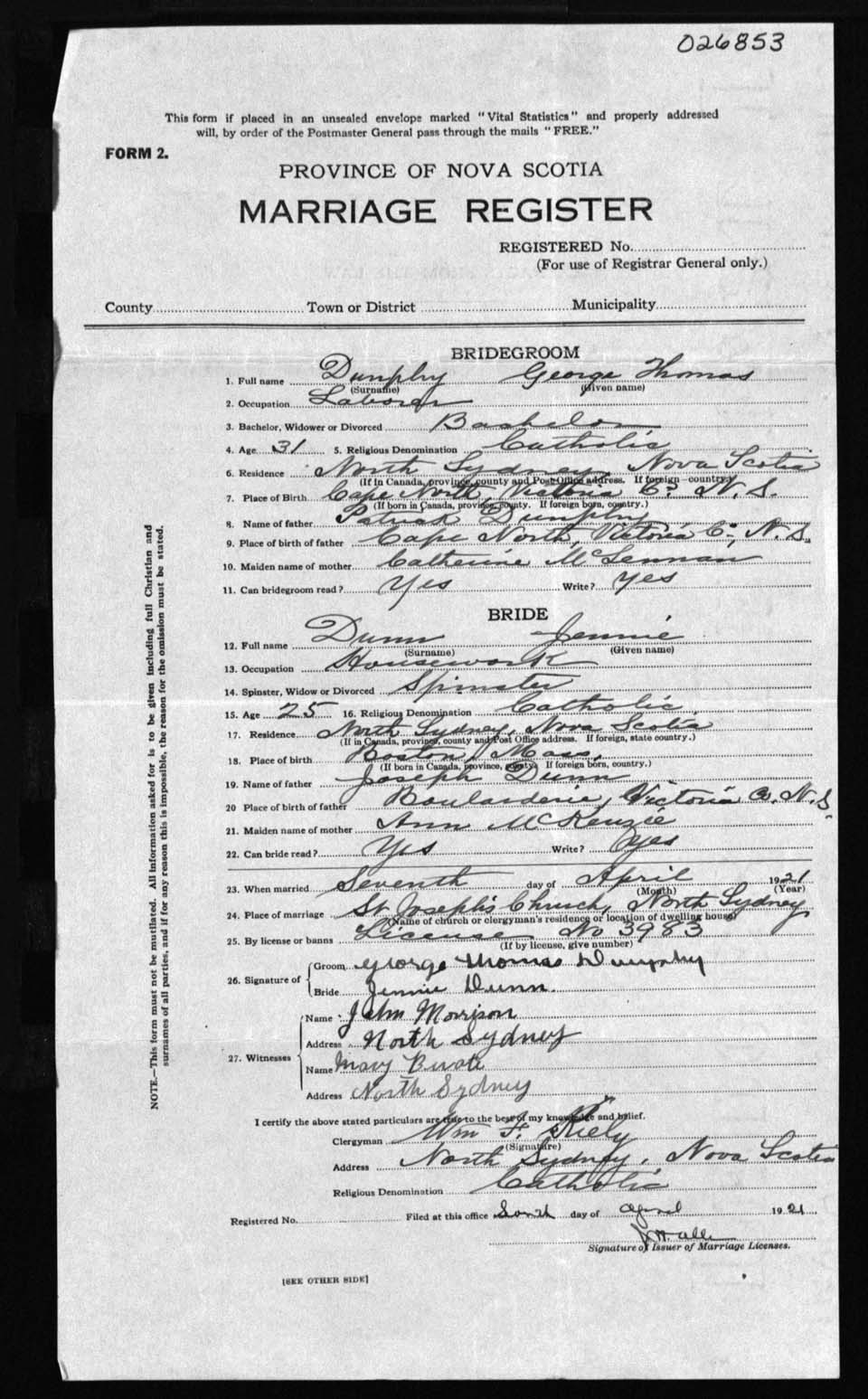 Registration: Year: 1921 number: 26853