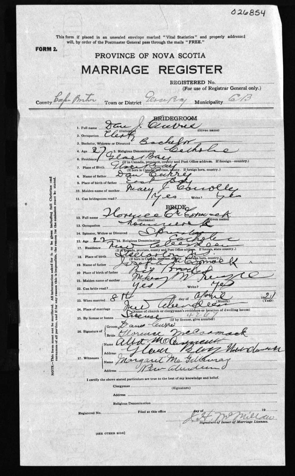 Registration: Year: 1921 number: 26854