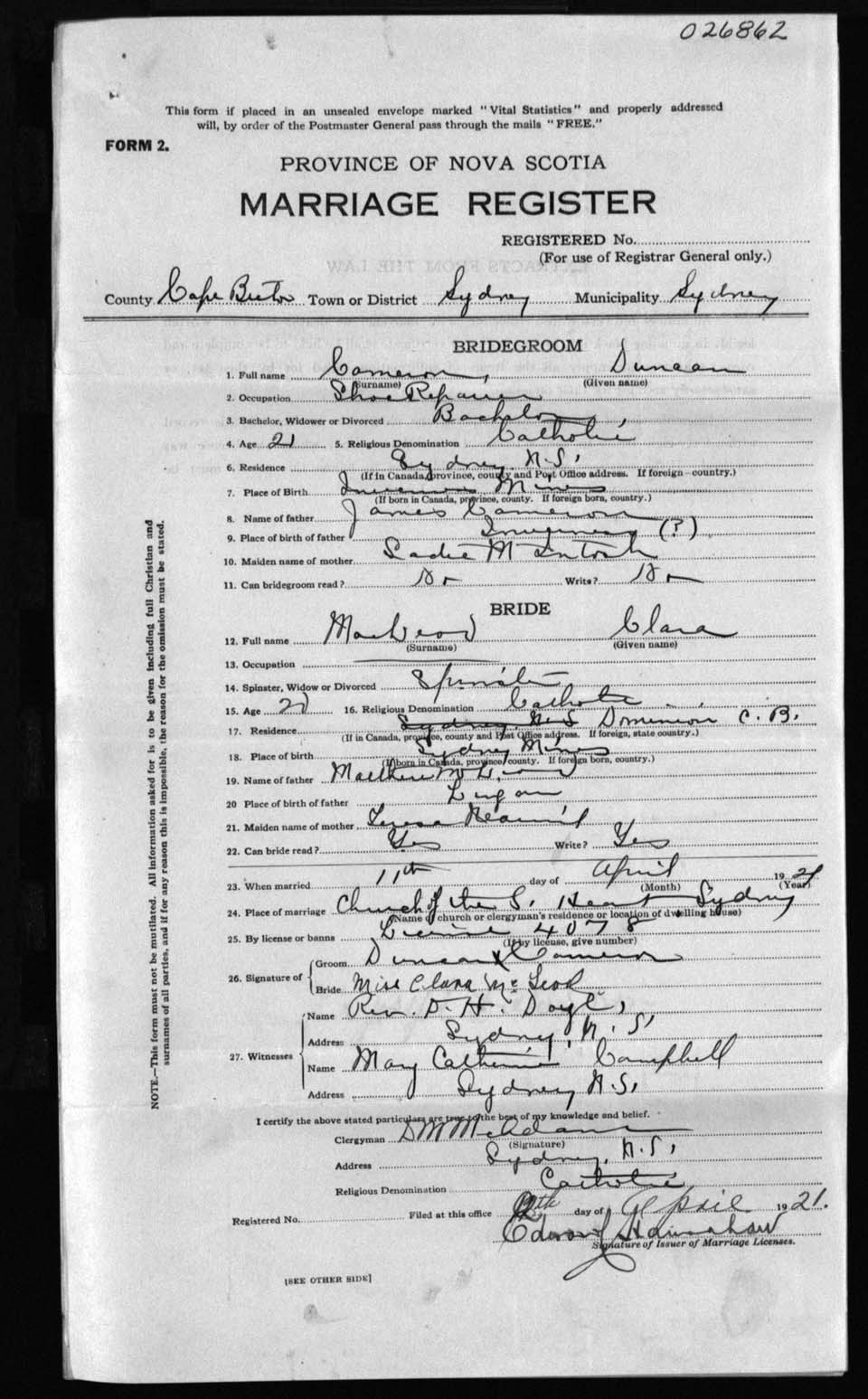 Registration: Year: 1921 number: 26862