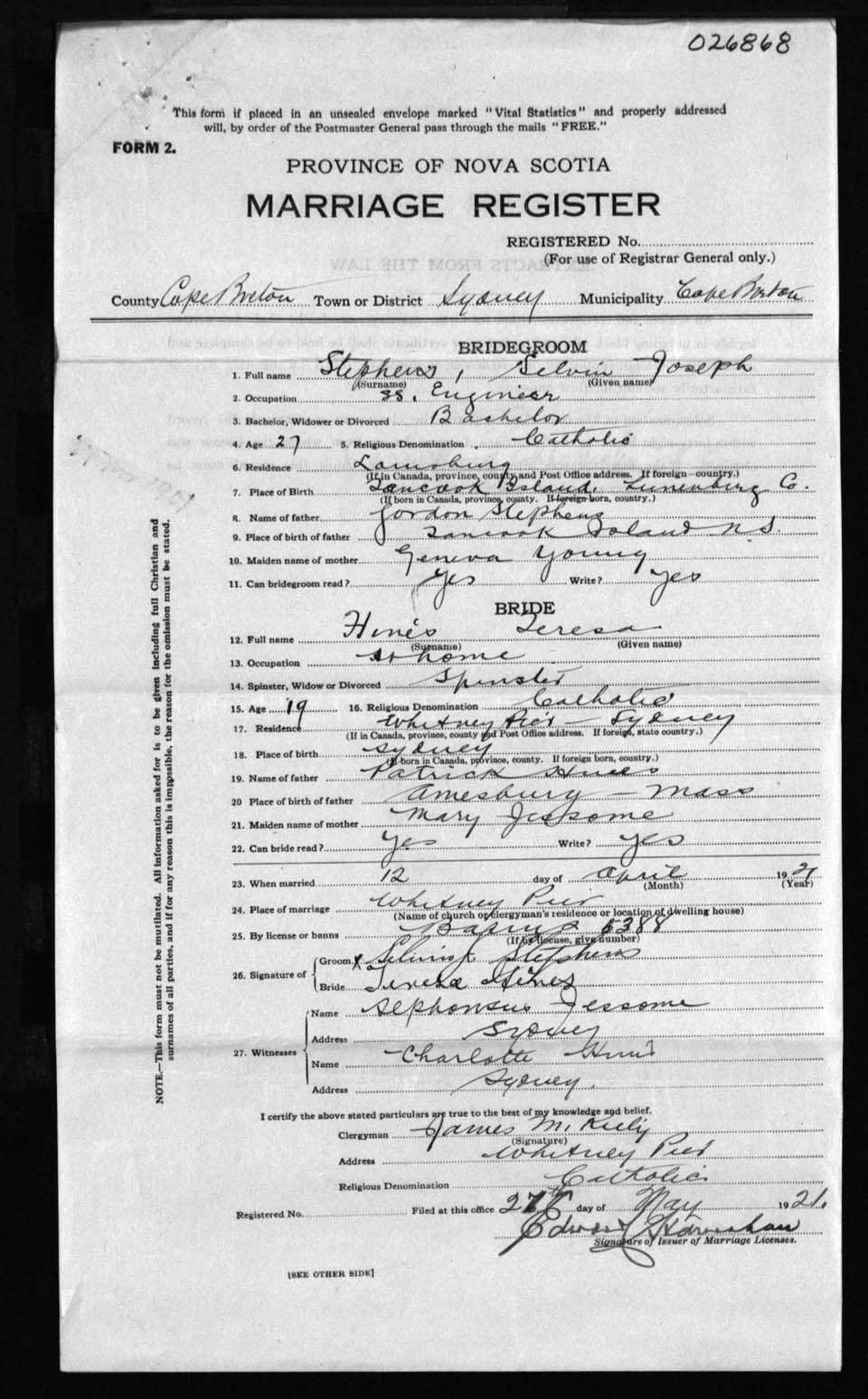 Registration: Year: 1921 number: 26868
