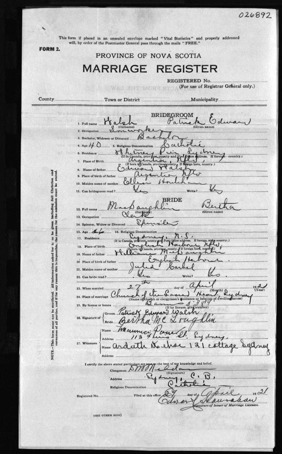 Registration: Year: 1921 number: 26892