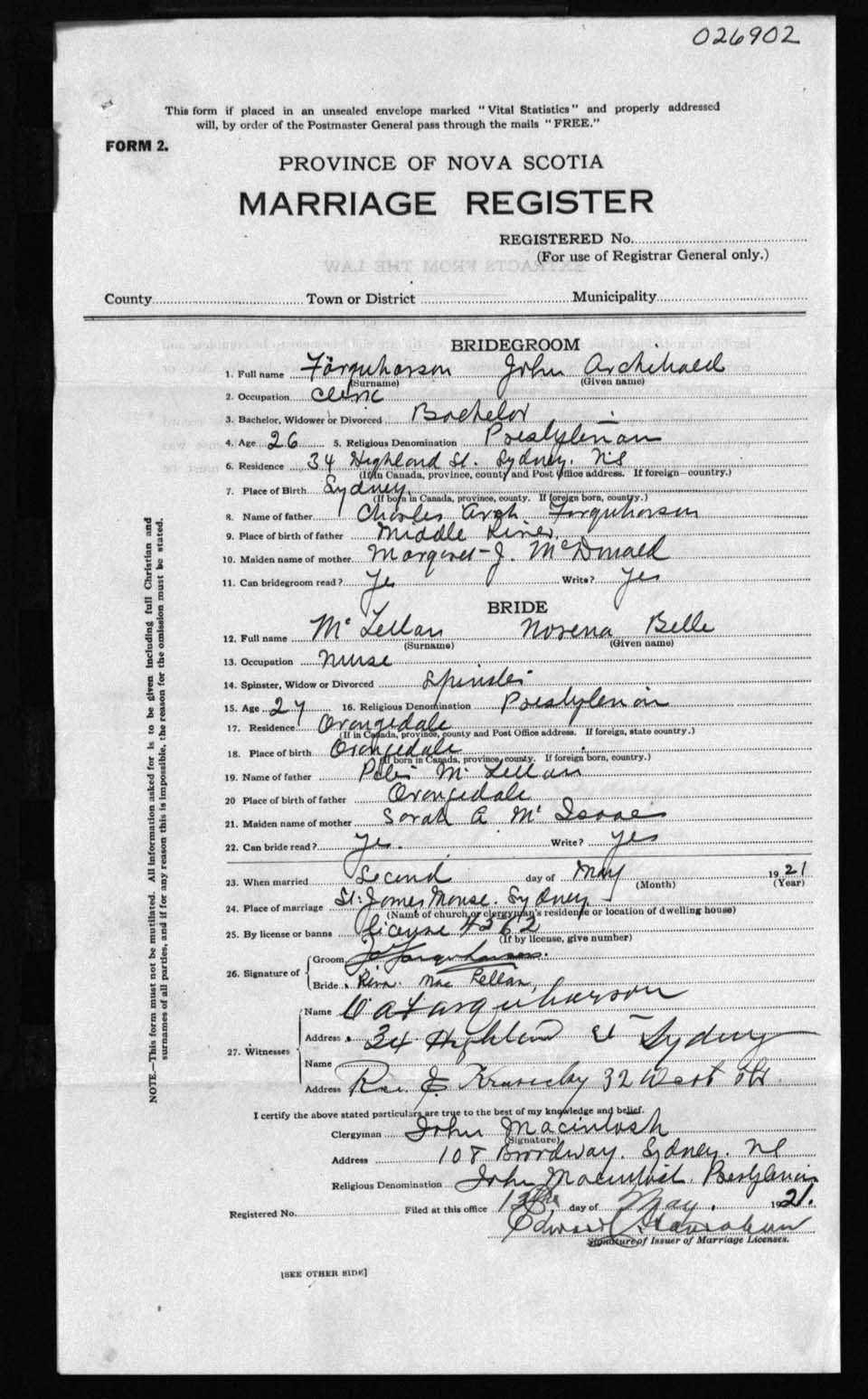 Registration: Year: 1921 number: 26902
