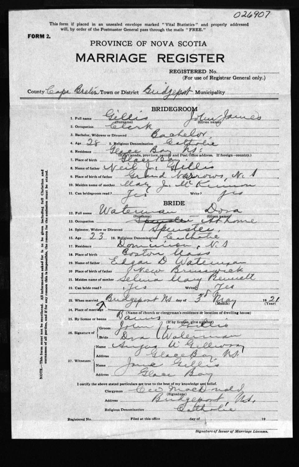 Registration: Year: 1921 number: 26907
