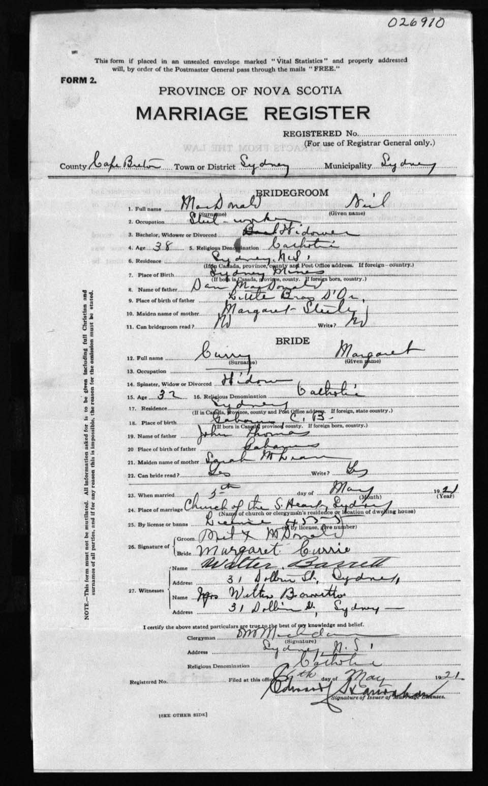 Registration: Year: 1921 number: 26910