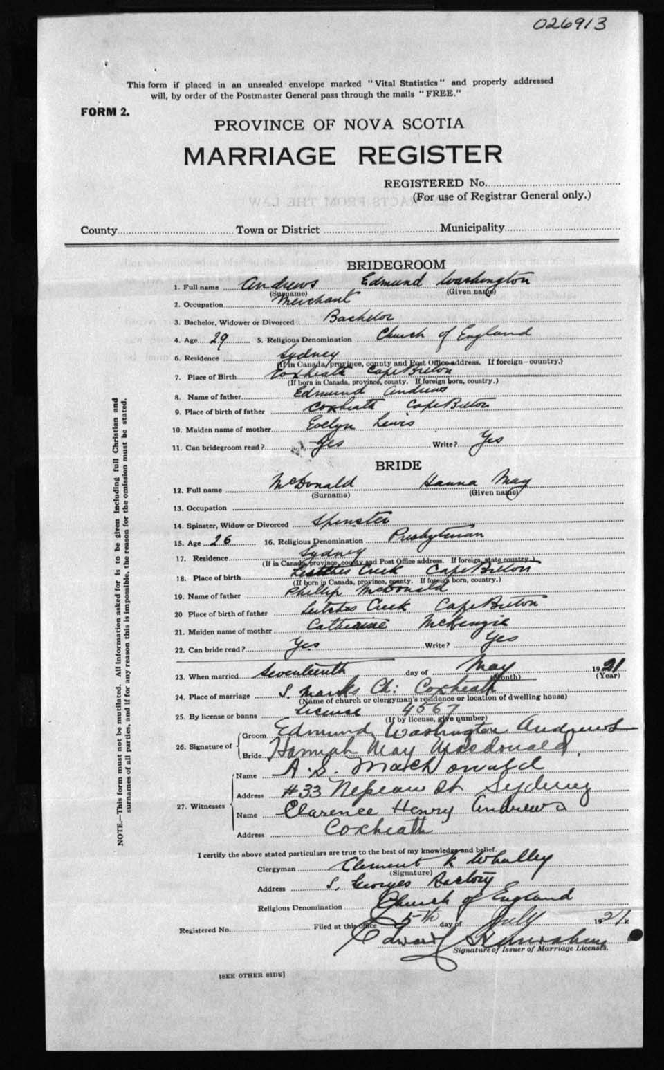 Registration: Year: 1921 number: 26913