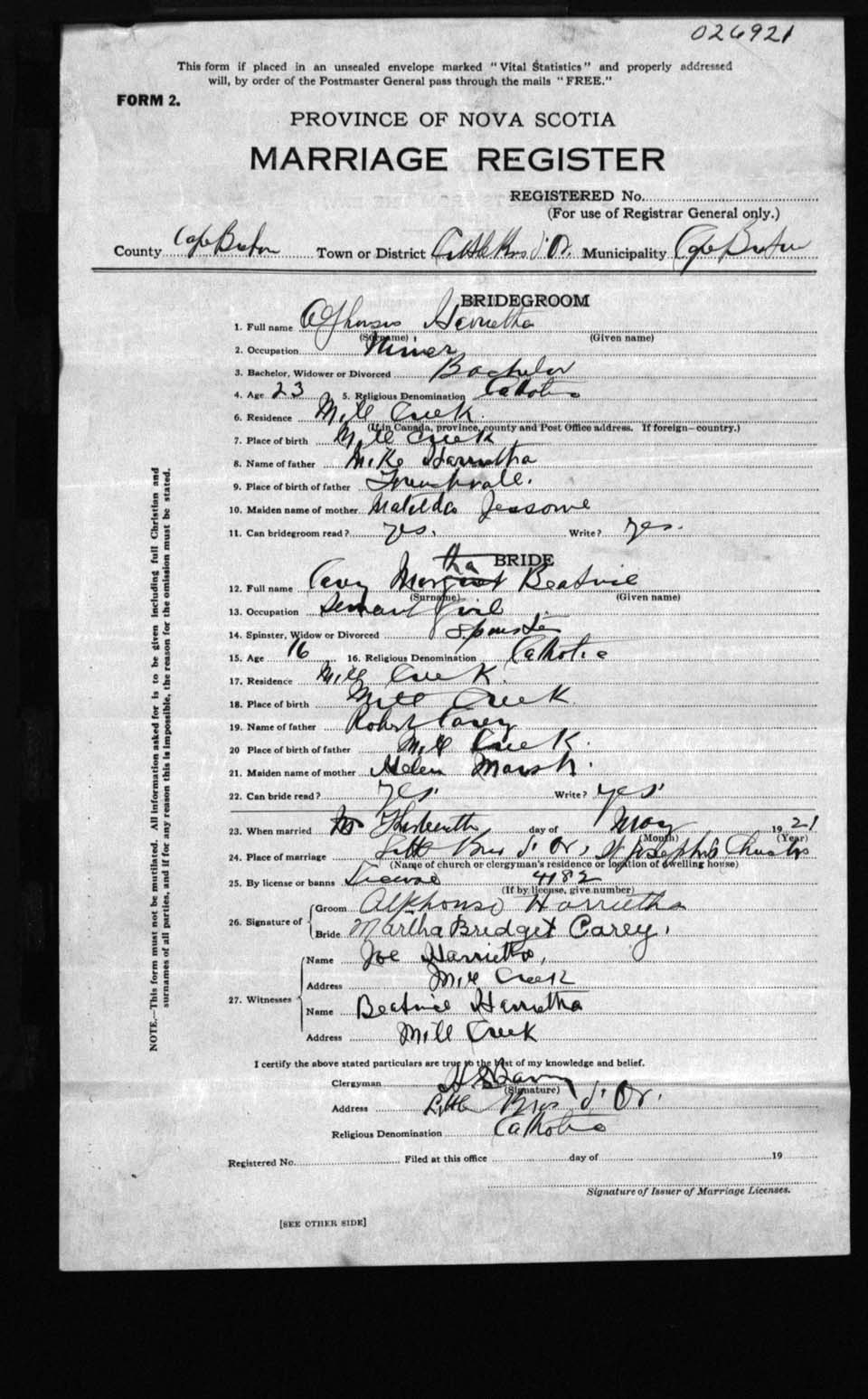 Registration: Year: 1921 number: 26921