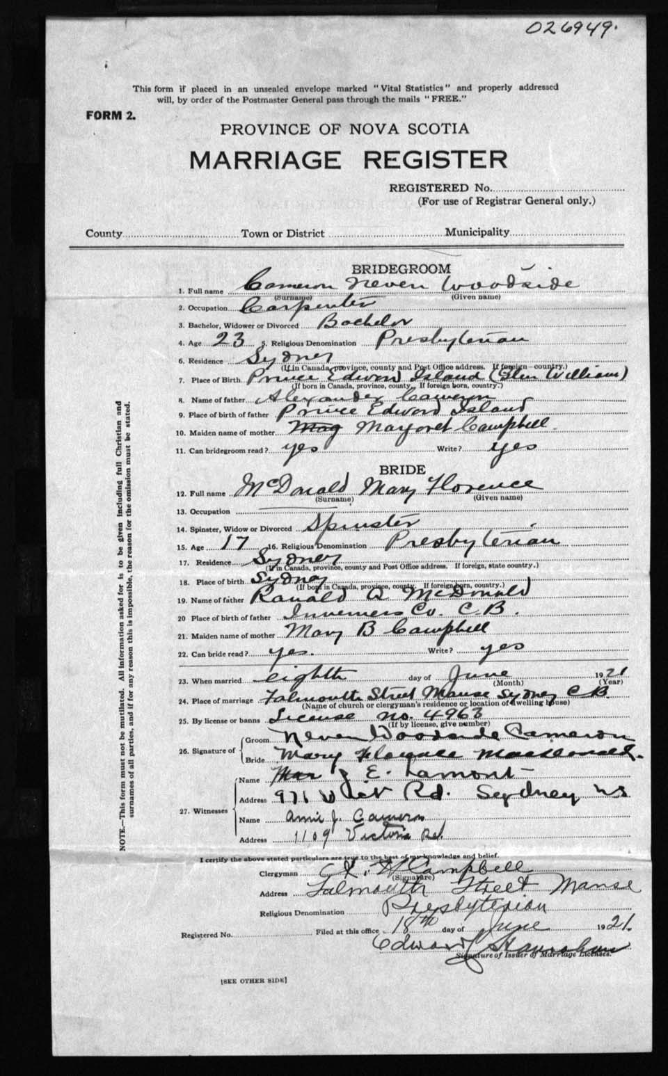 Registration: Year: 1921 number: 26949