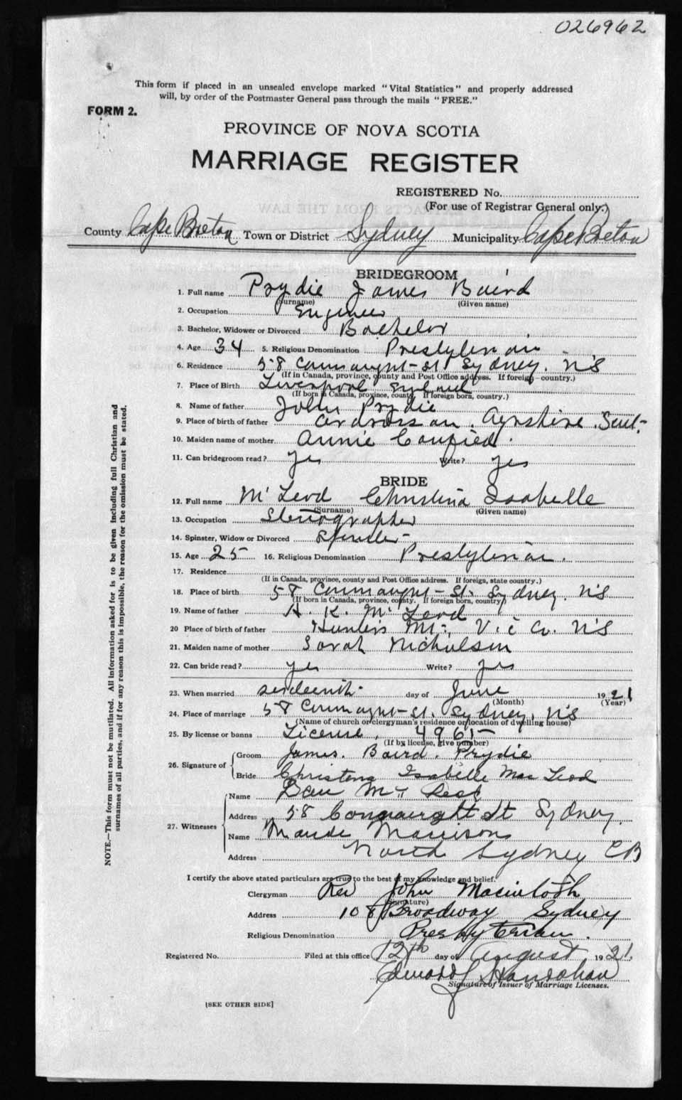 Registration: Year: 1921 number: 26962