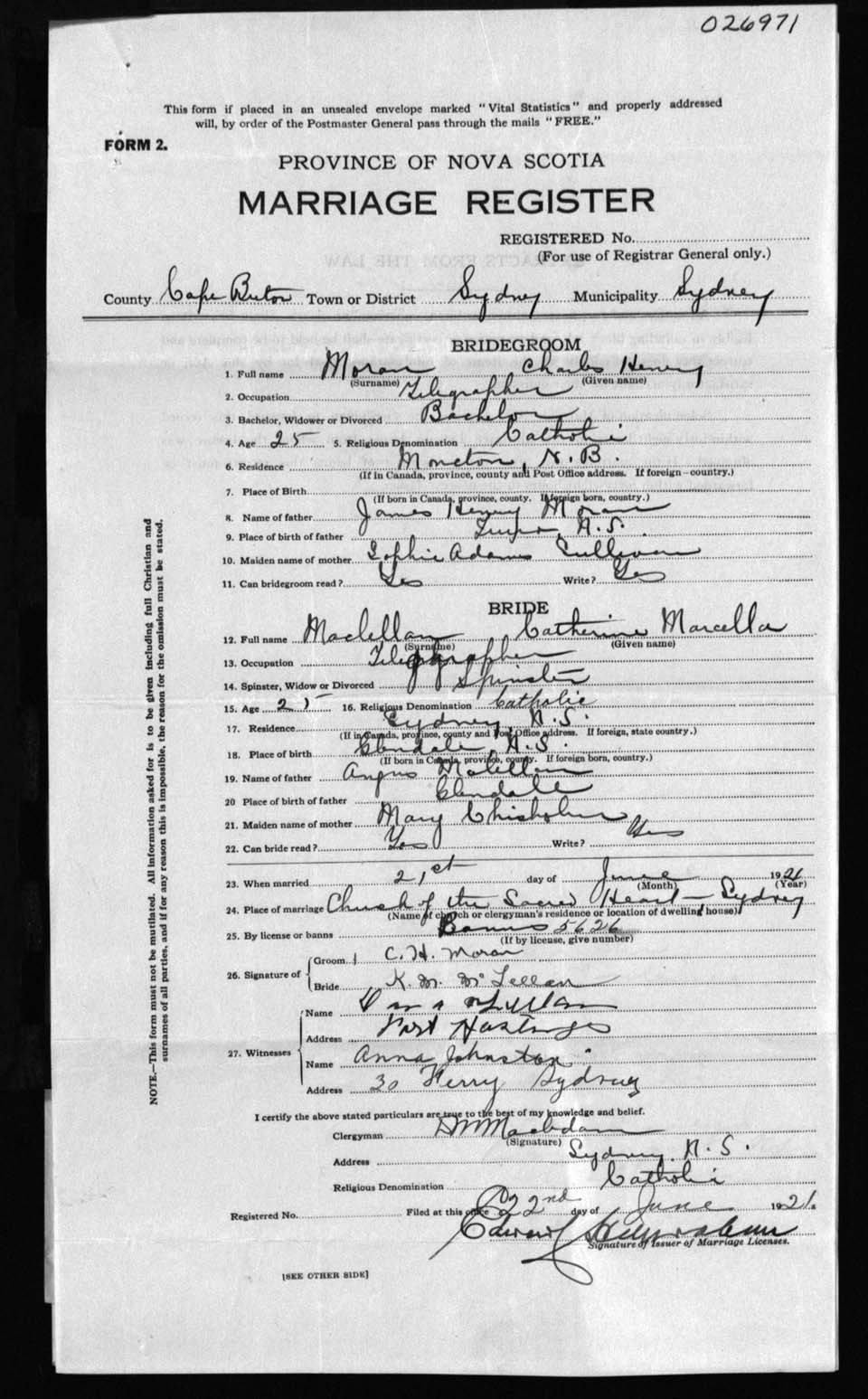 Registration: Year: 1921 number: 26971