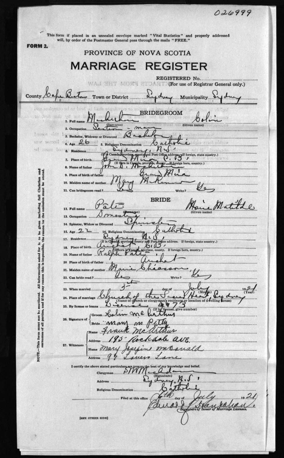 Registration: Year: 1921 number: 26999