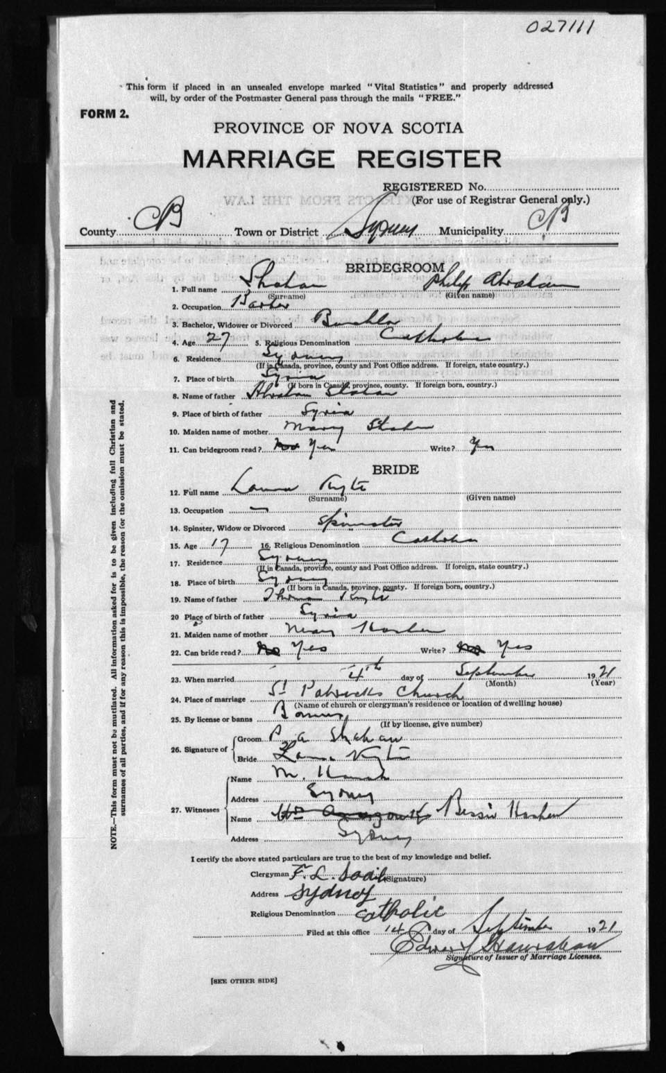 Registration: Year: 1921 number: 27111