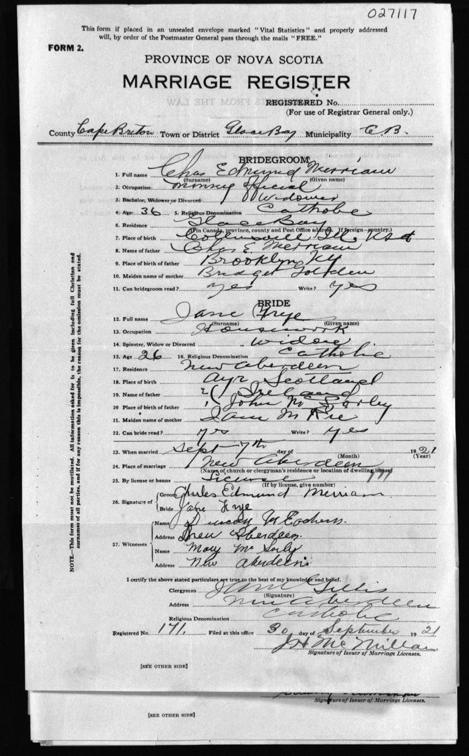 Registration: Year: 1921 number: 27117