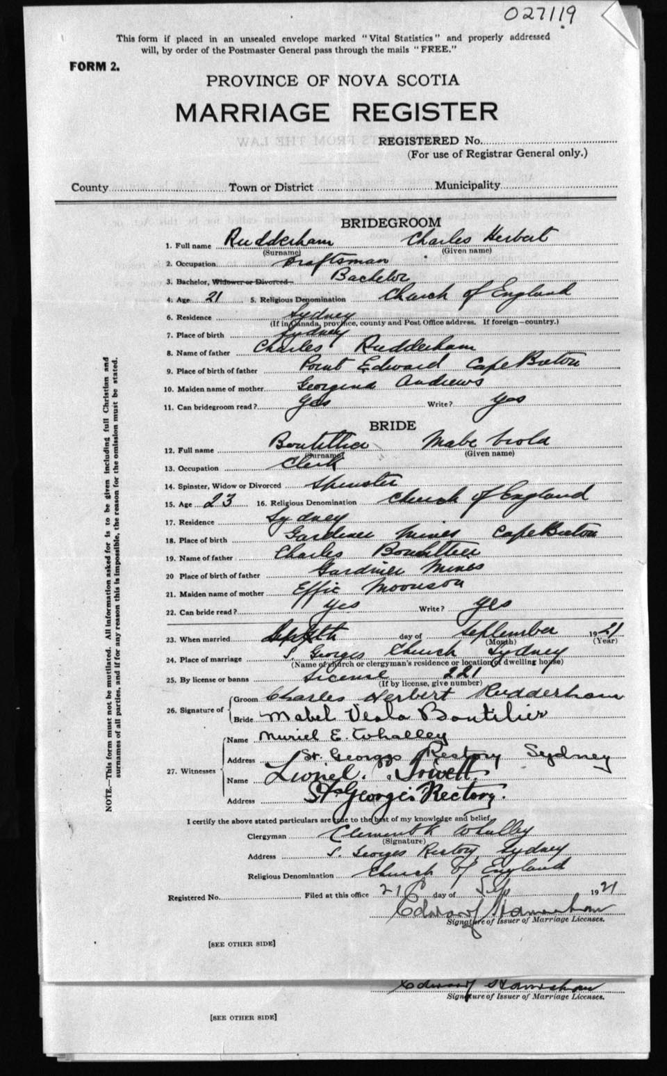 Registration: Year: 1921 number: 27119