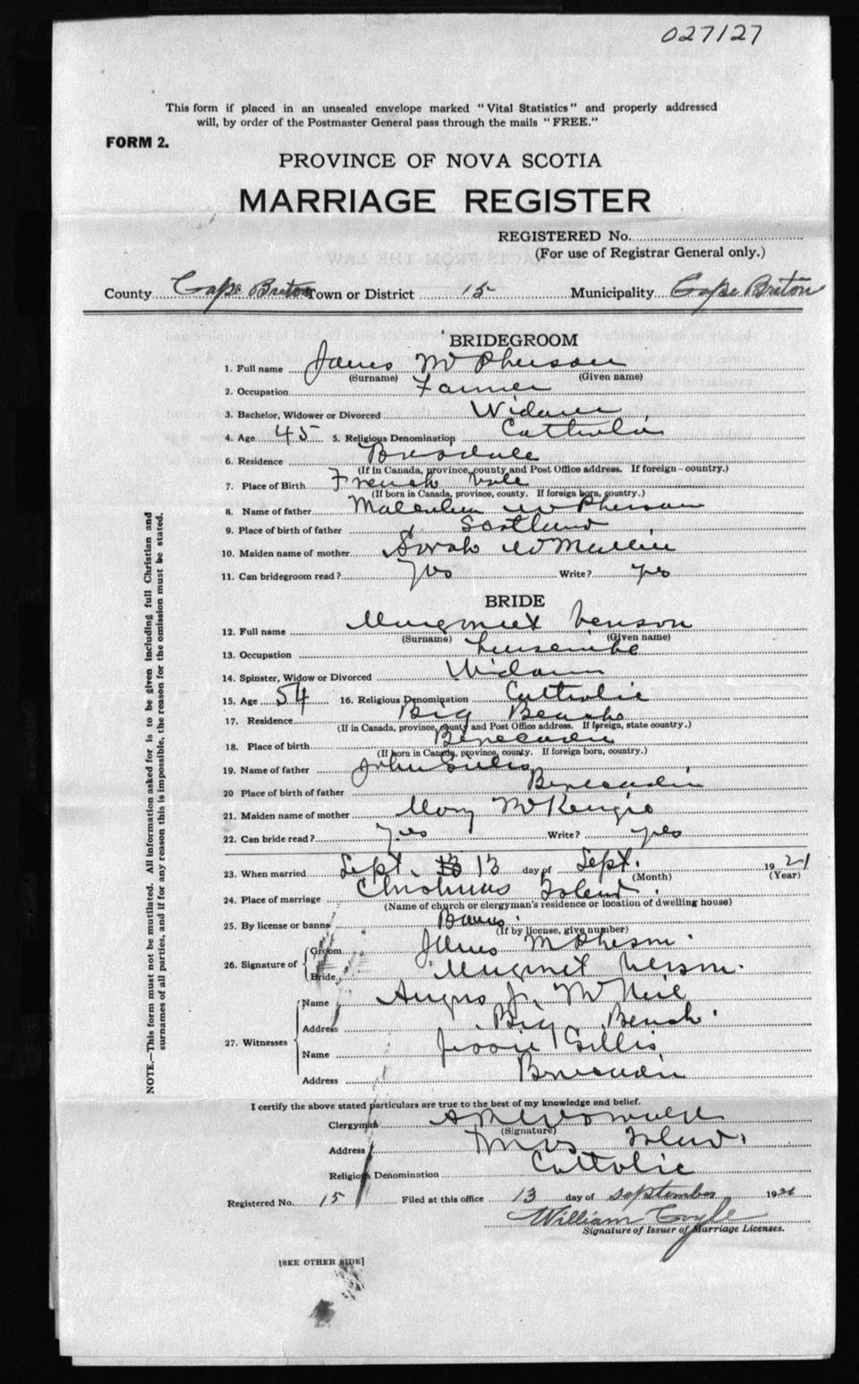 Registration: Year: 1921 number: 27127