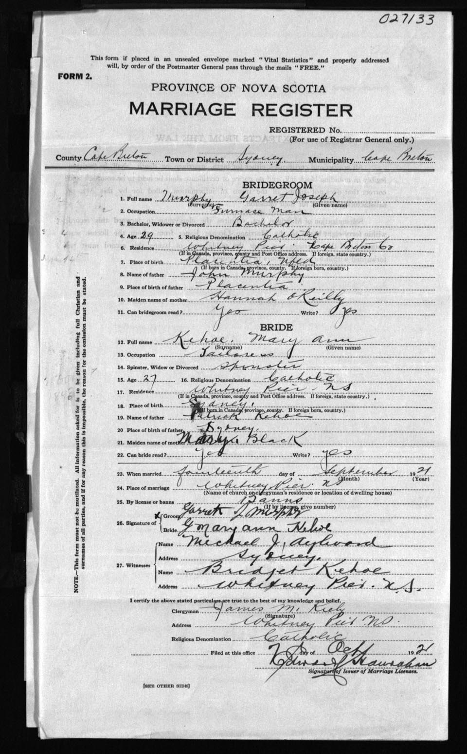Registration: Year: 1921 number: 27133