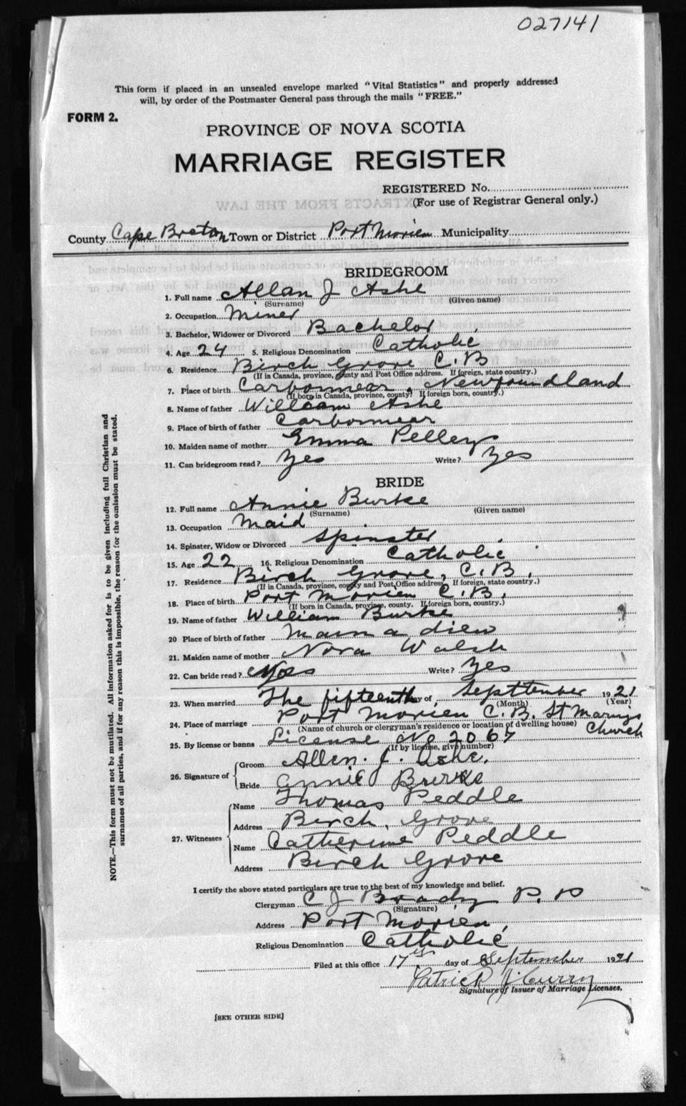 Registration: Year: 1921 number: 27141