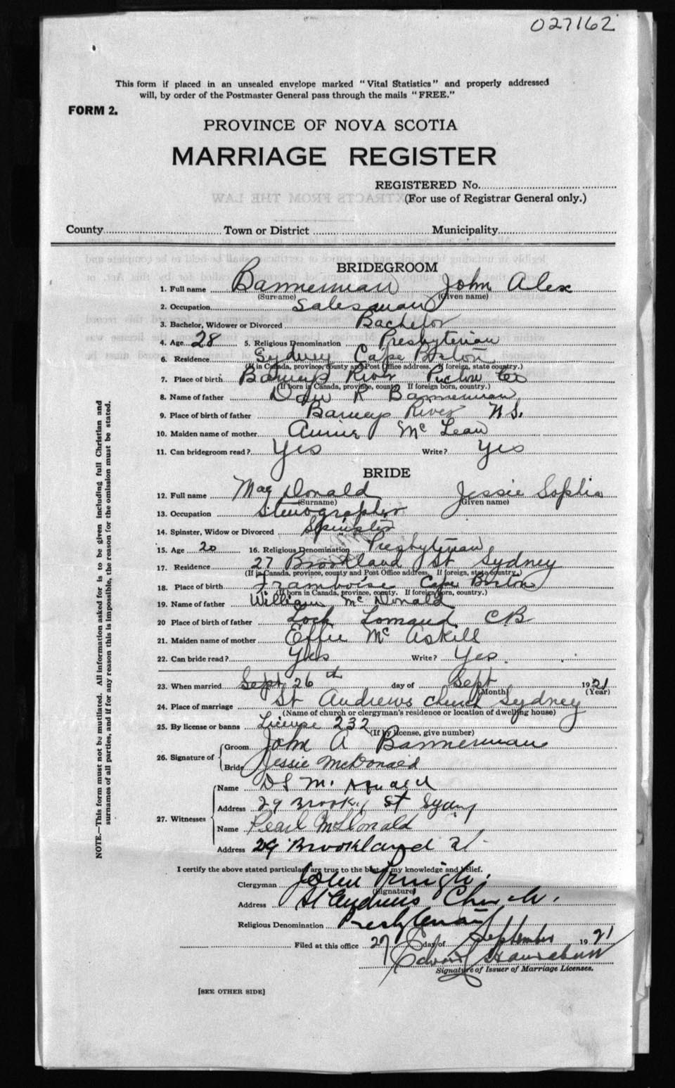 Registration: Year: 1921 number: 27162