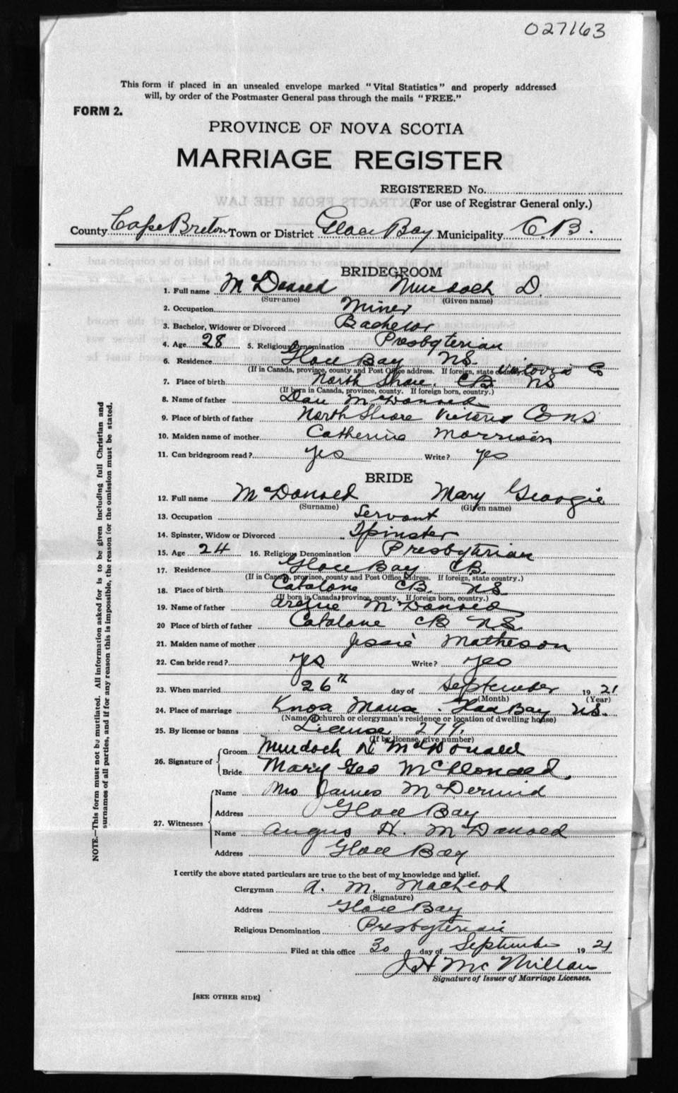 Registration: Year: 1921 number: 27163