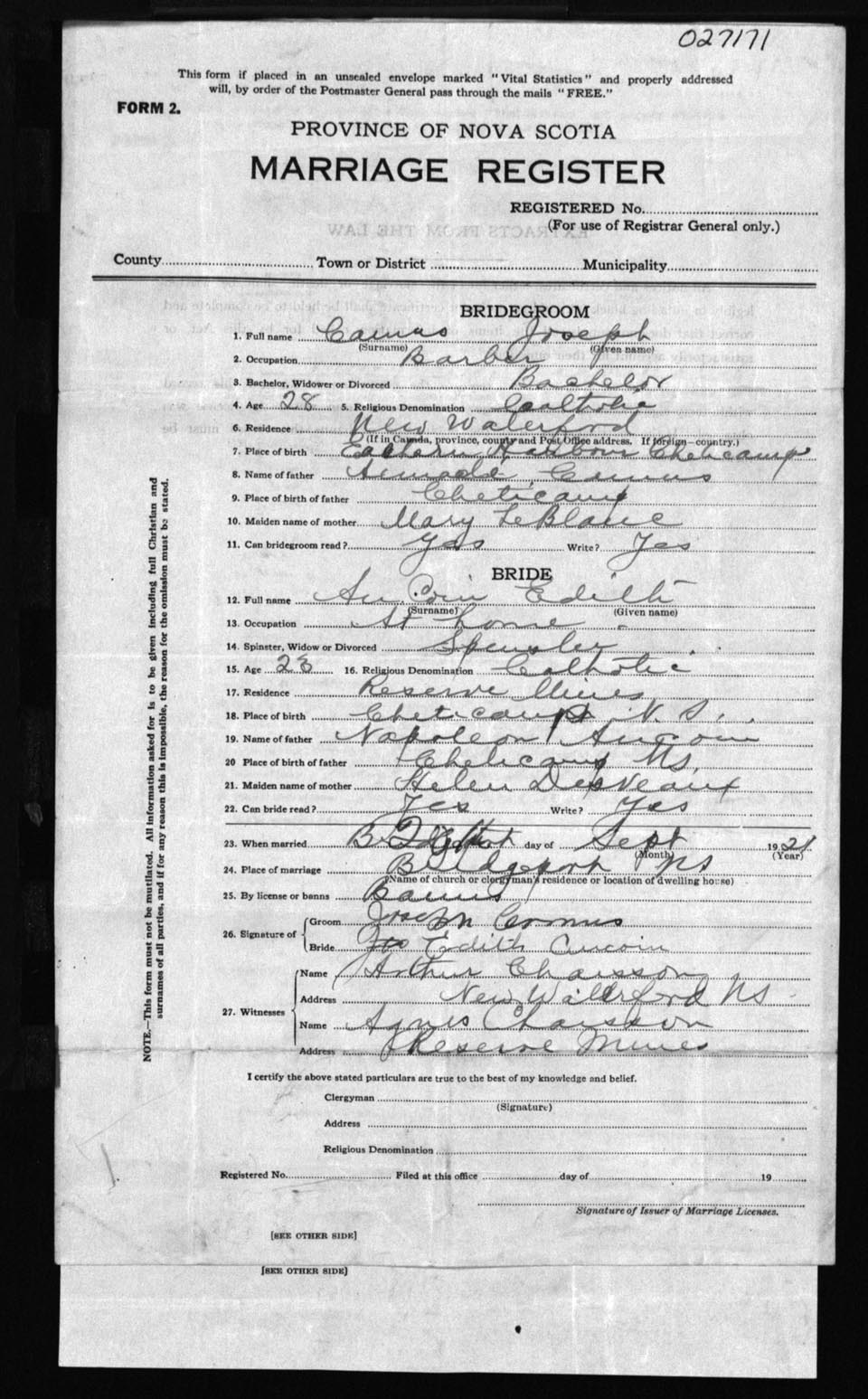 Registration: Year: 1921 number: 27171