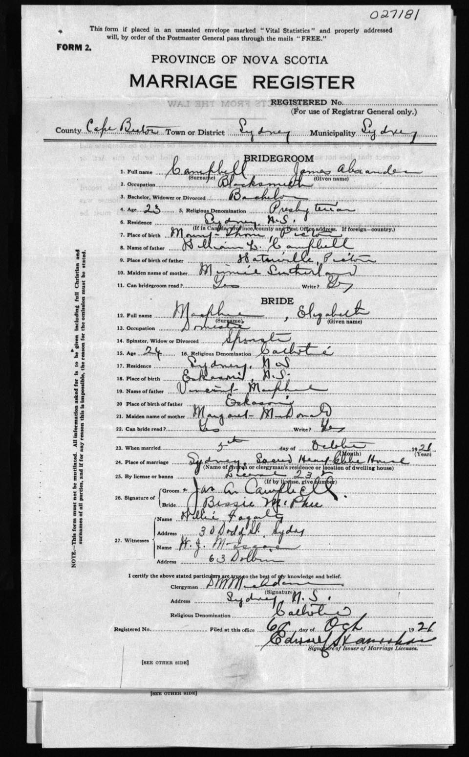Registration: Year: 1921 number: 27181