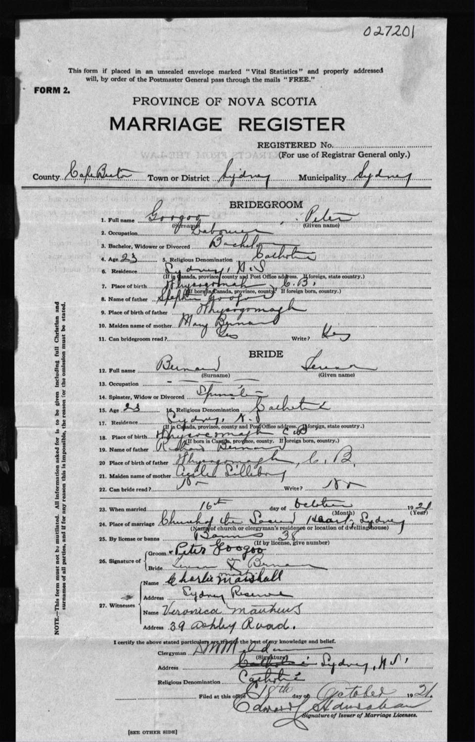 Registration: Year: 1921 number: 27201