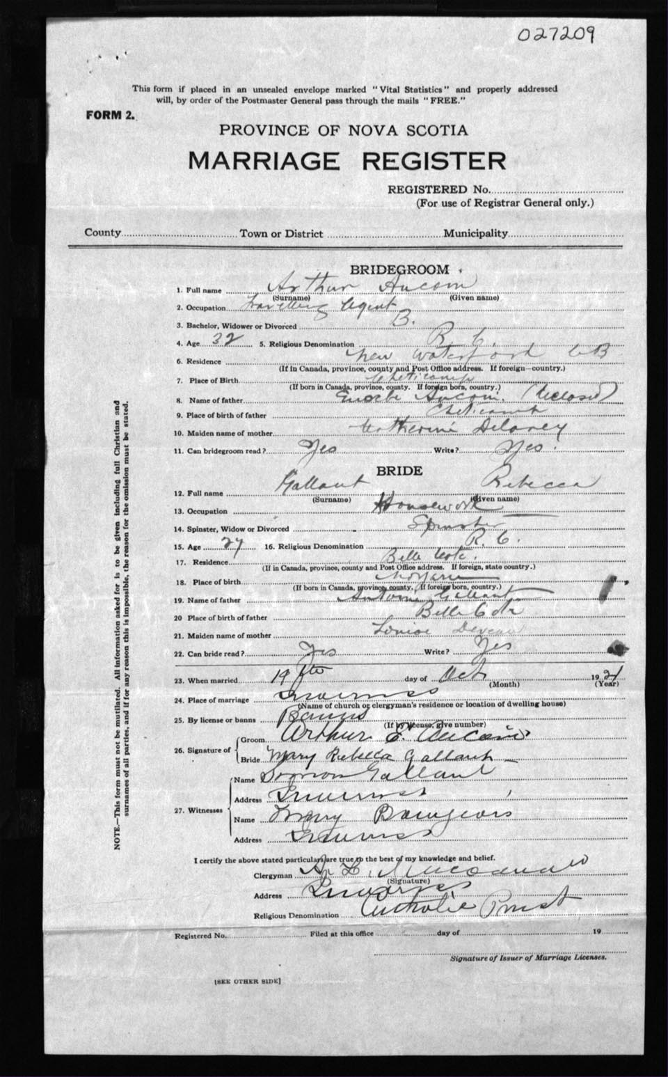 Registration: Year: 1921 number: 27209