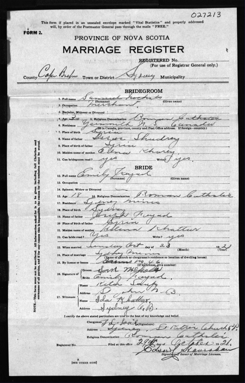 Registration: Year: 1921 number: 27213