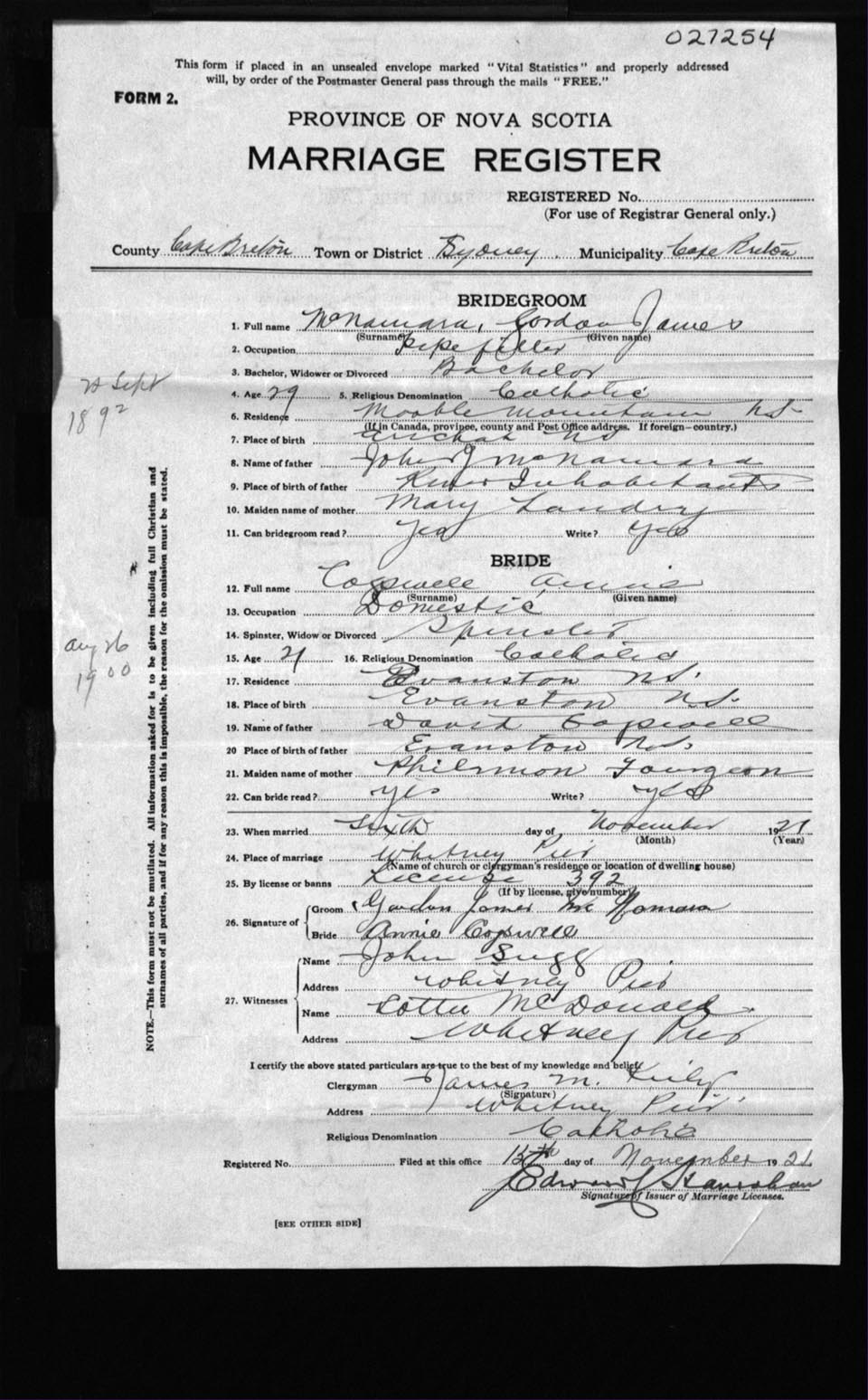 Registration: Year: 1921 number: 27254