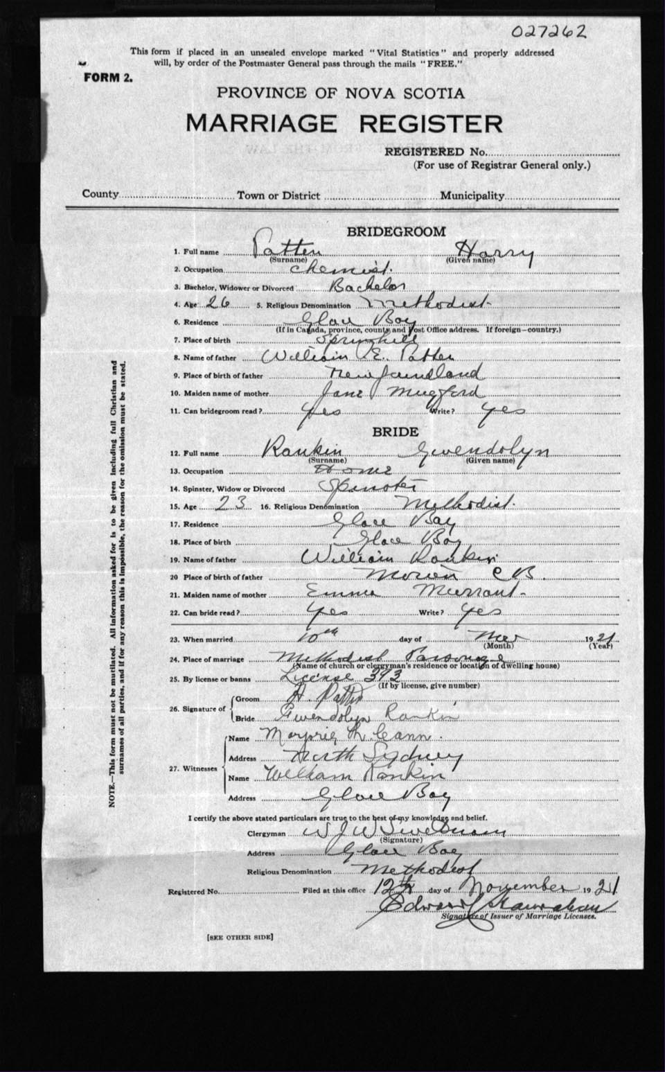 Registration: Year: 1921 number: 27262