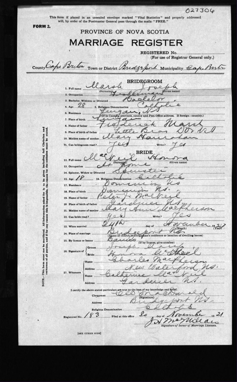 Registration: Year: 1921 number: 27306