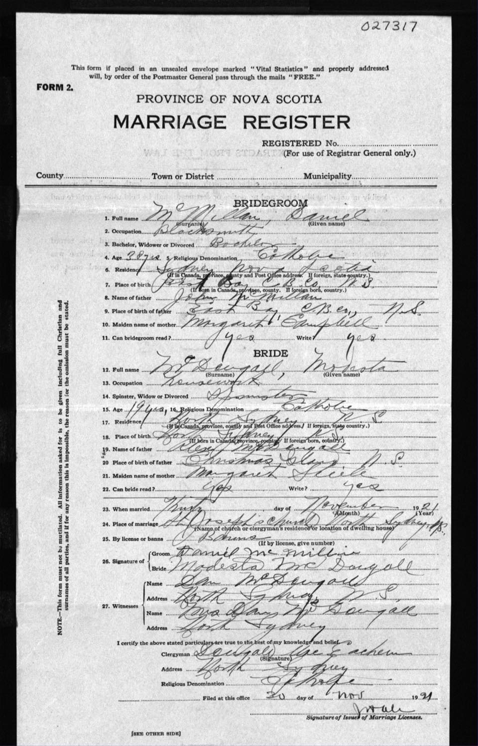 Registration: Year: 1921 number: 27317