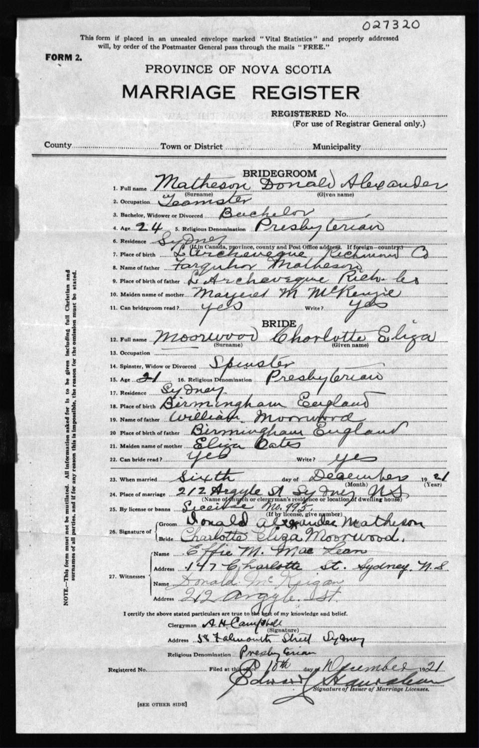Registration: Year: 1921 number: 27320