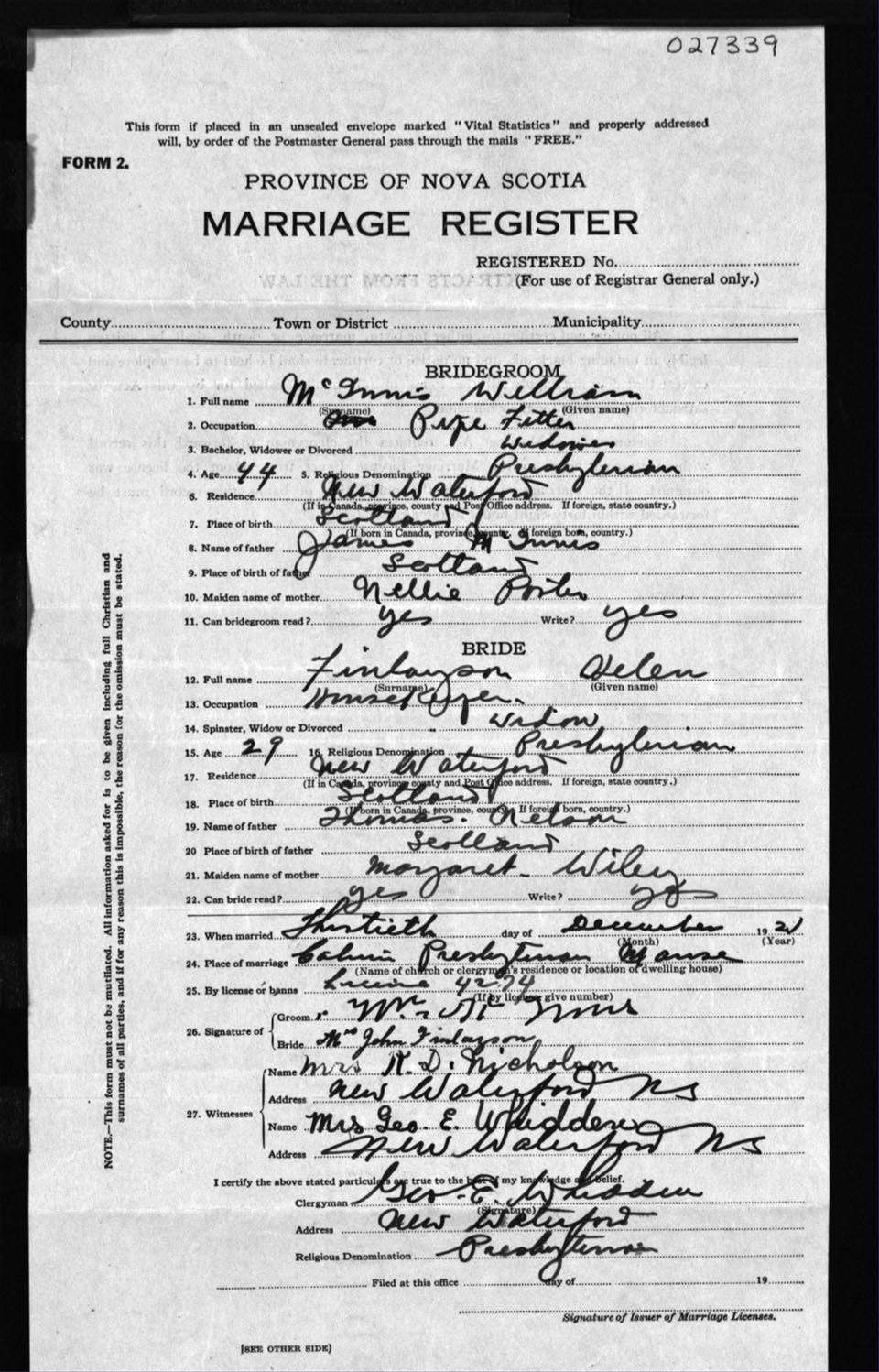 Registration: Year: 1921 number: 27339