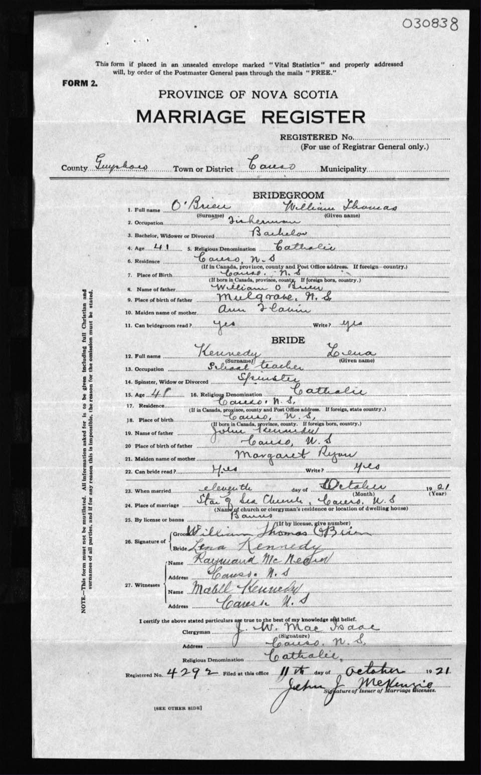 Registration: Year: 1921 number: 30838