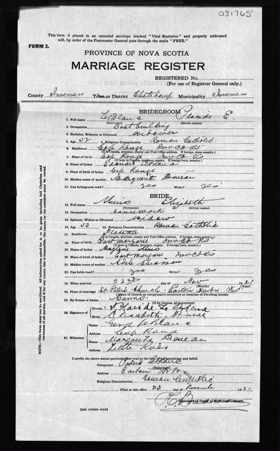 Registration: Year: 1921 number: 31765