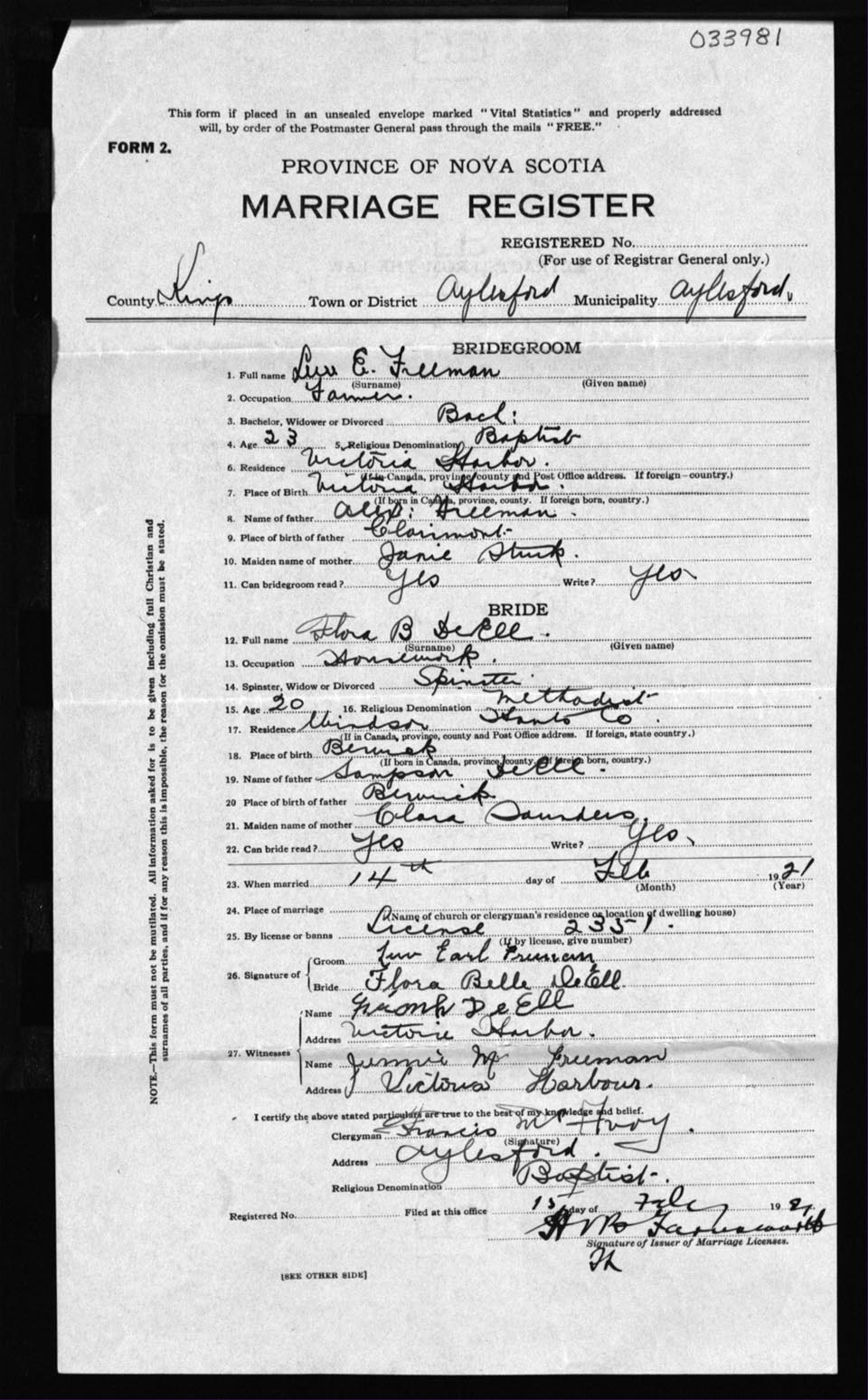 Registration: Year: 1921 number: 33981