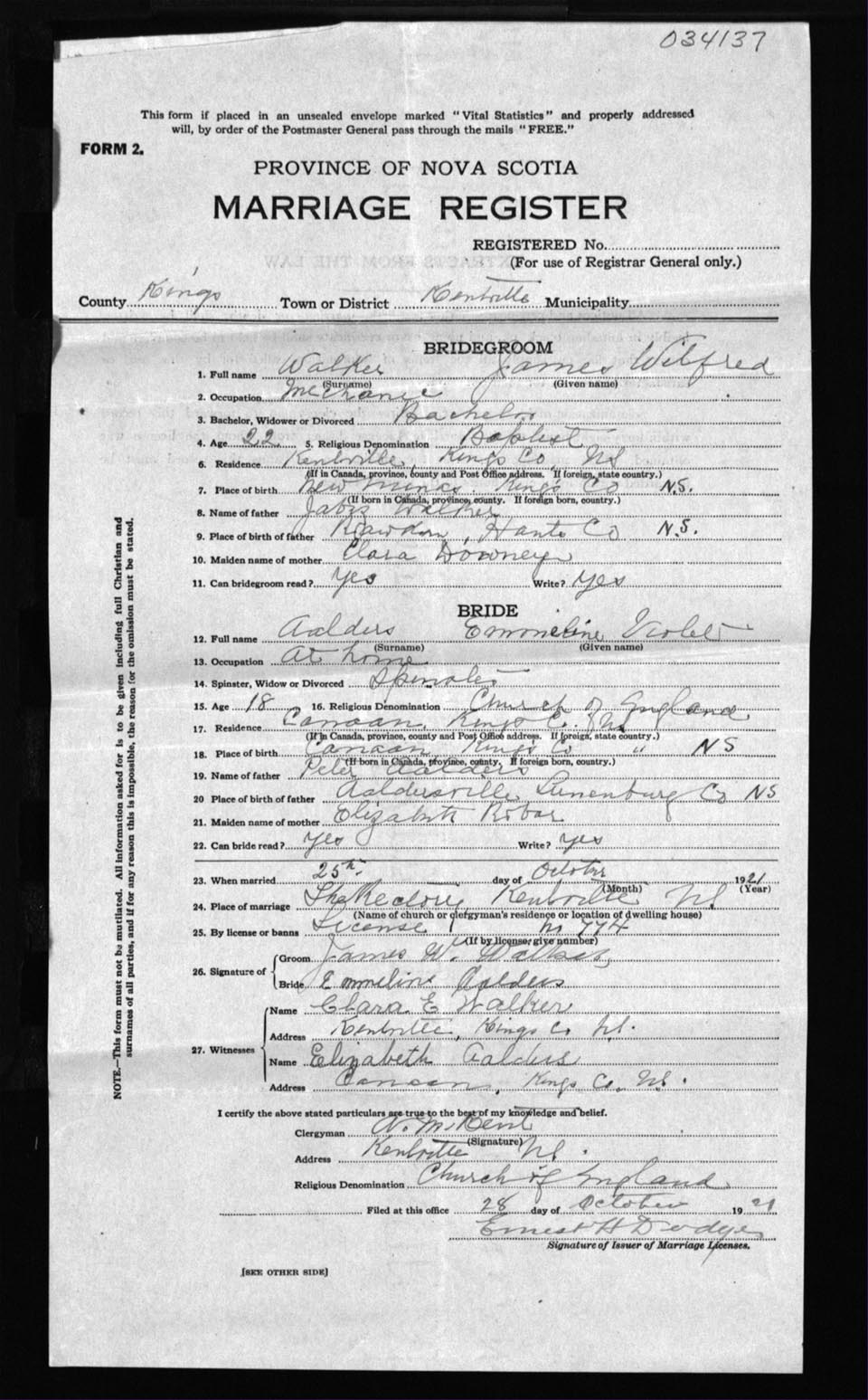 Registration: Year: 1921 number: 34137