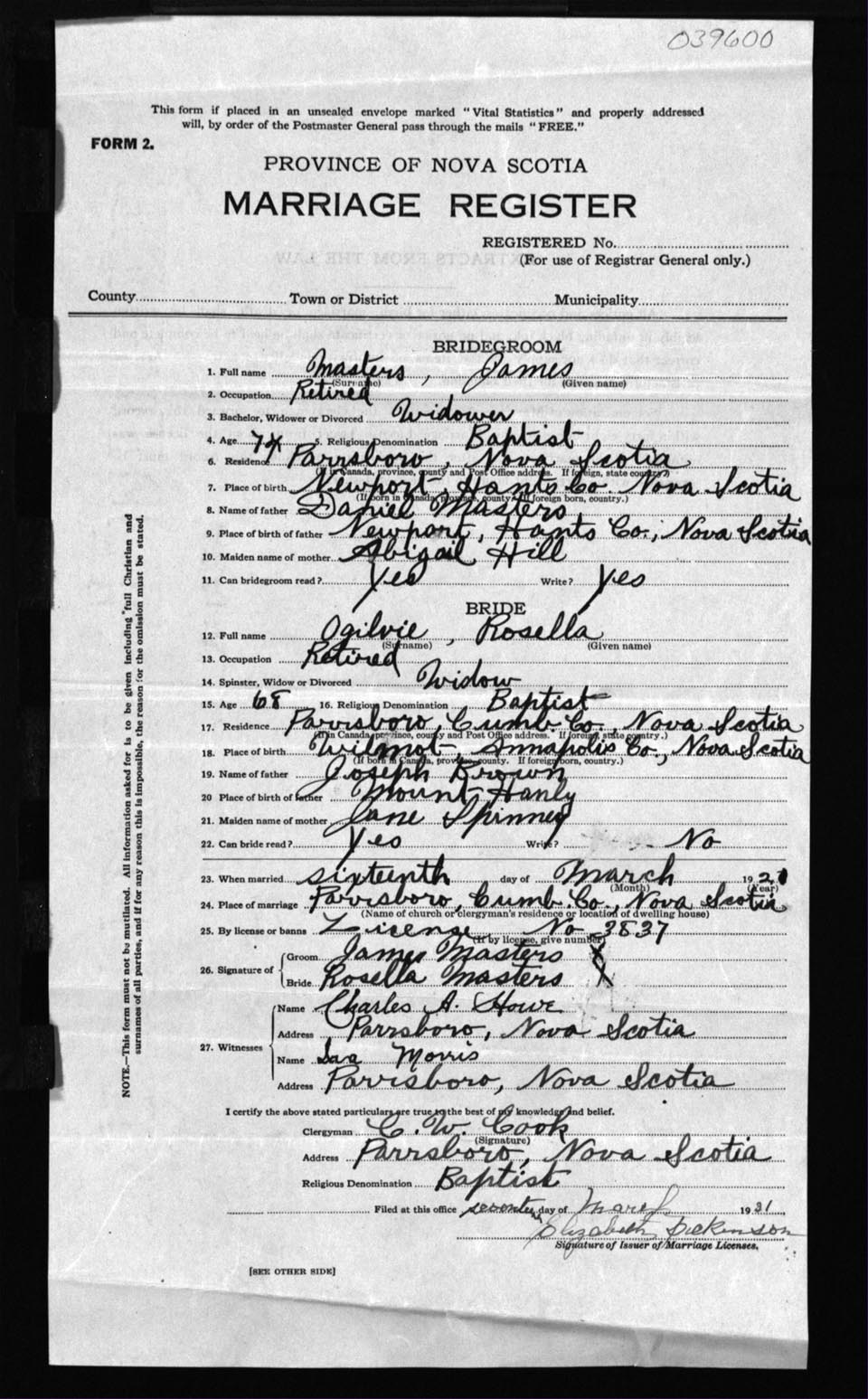Registration: Year: 1921 number: 39600