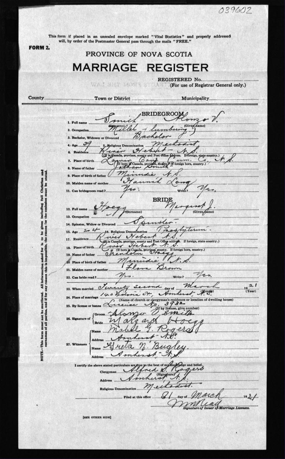 Registration: Year: 1921 number: 39602