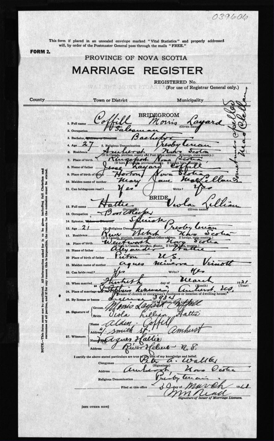Registration: Year: 1921 number: 39606