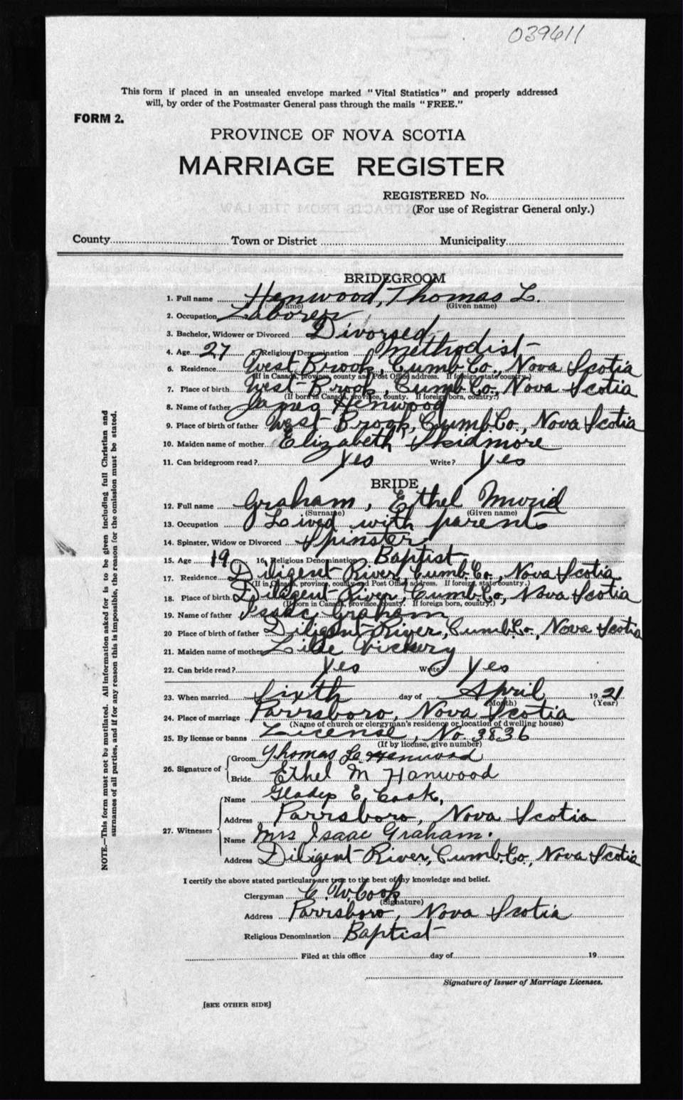 Registration: Year: 1921 number: 39611