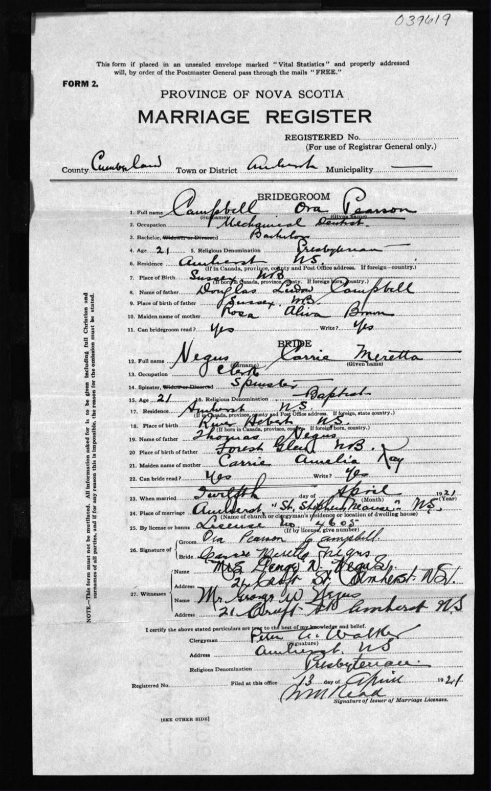 Registration: Year: 1921 number: 39619