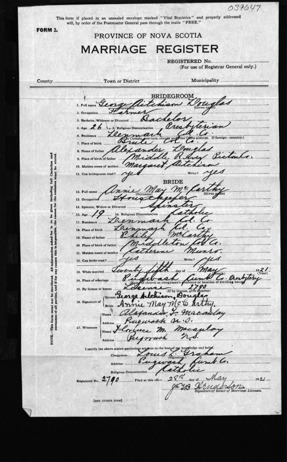 Registration: Year: 1921 number: 39647