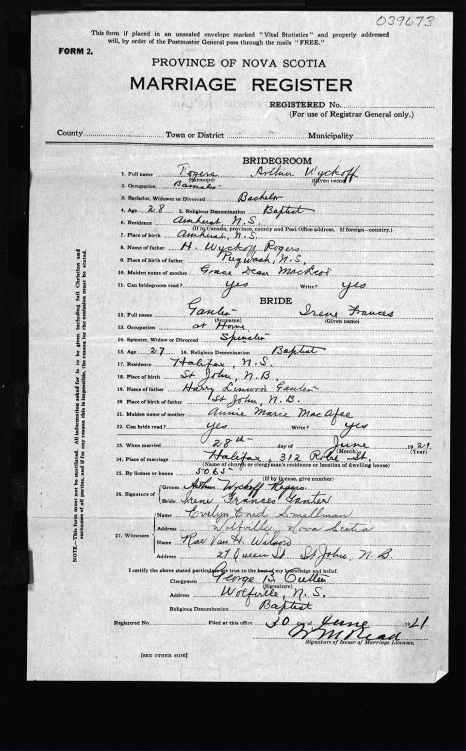 Registration: Year: 1921 number: 39673
